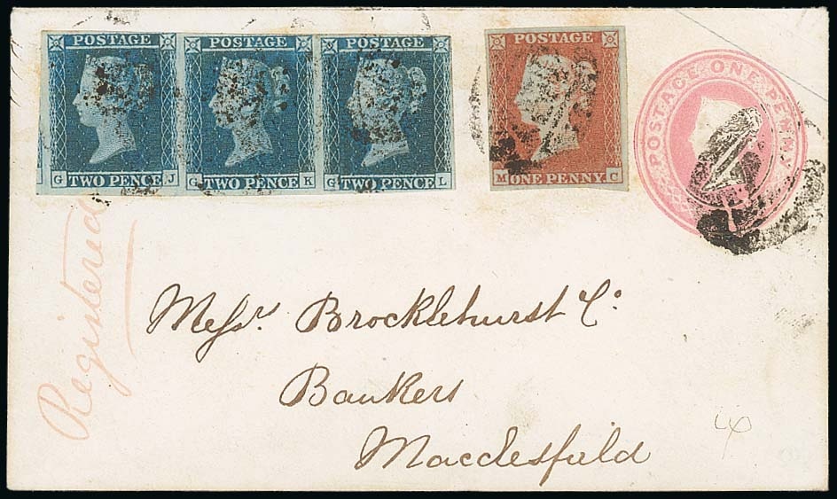 1851 (11 Aug.) Brocklehurst Penny Pink envelope to Macclesfield uprated with 1841 1d. red-brown, plate 123, MC (good to large margins) and 1841 2d. blue, plate 4, GJ-GL strip of three (close to very large margins) cancelled by indistinct "730" numerals with "Registered" in red ink at left, the reverse with Stafford and Macclesfield (12.8) c.d.s. in blue and the complete red wax seal; some light staining on the reverse, an attractive and unusual franking; the envelope seems too small to warrant the additional 1d. franking. Photo