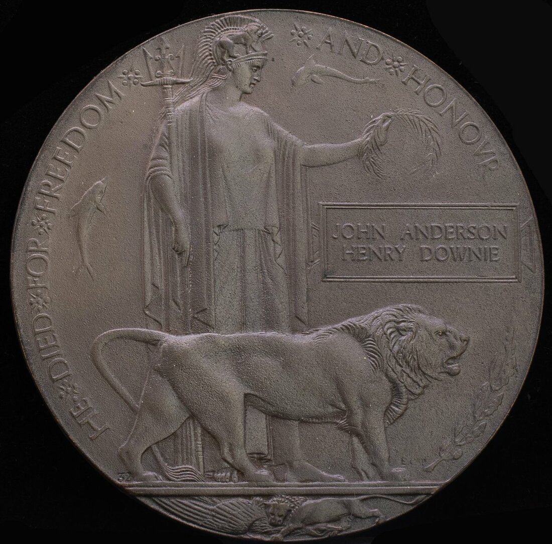 1914-15 Star (17322 L. Cpl J. A. H. Downie. L'Pool R.)); British War and Victory Medals (17322 Pte. J. A. H. Downie. L'Pool R.); Great War Bronze Memorial Plaque (John Anderson Henry Downie), polished, heavy contact wear, overall nearly very fine (4)