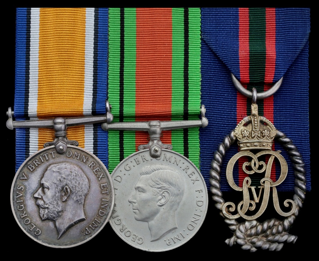 Appointed to the Trade Division of the War Staff on 7 August 1914 he was promoted Lieutenant Commander on 24 December 1915. Recommended for promotion in October 1917 with a comment in his records that he was 'Zealous & hardworking. Keen on improving his knowledge in Naval matters', Ginman was promoted Acting Commander on 31 March 1918. Placed on Special Service with the Appointments Department of the Ministry of Labour on 11 December 1918 he was allowed to retain the rank of Commander beyond his war service. Demobilised on 1 September 1919, again retaining his acting rank. Awarded the R.N.V.R. decoration in May 1922 he retired in June of that year; sold together with typed research and scanned extracts from London's Navy, A story of the Royal Naval Volunteer Reserve.