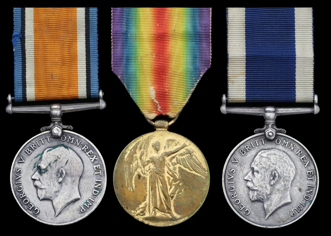 British War Medal 1914-20 (J.44597 T. E. Smith. A. B. R. N.); Victory Medal 1914-1919 (J. A. [...] Smith. A. B. R. N.), the naming worn and renamed; Royal Navy L.S. & G.C., G.V.R. (K. 60286 T. E. Smith, Sto. 1, H,M.S. Courageous), heavy contact marks and polish to first and third, overall good fine (3)