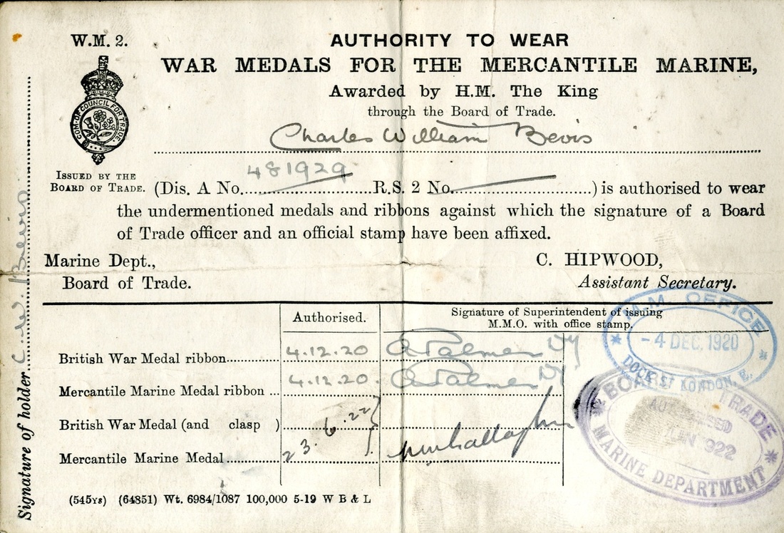 Charles William Bevis was born at Richmond, Surrey in October 1883, the son of Charles and Anne Bevis of 35 Richmond Villa. Serving aboard the Ophir from 9 June 1908 Bevis was present when she steamed into the Italian Port of Messina to provide aid after the Earthquake on 28 December 1908. He later saw service on such vessels as the Laconia and Osterley, aboard which he saw war service. Bevis' final posting was aboard the Orama which he served on from 28 October 1932- 24 October 1935, this ill-fated vessel was destroyed by the Admiral Hipper some five years later on the return journey from Narvik; sold together with the recipient's discharge book, OHMS slip of issue and postcards relating to the Messina Earthquake and the Laconia, that latter with a message relating to the recipient's service as well as copied research including M.I.C., a newspaper article on the Messina Earthquake and information on the ships the recipient served aboard along with a service document dating to 1932 and handwritten research.