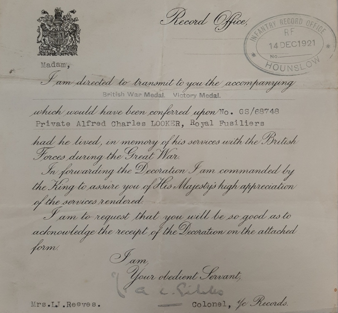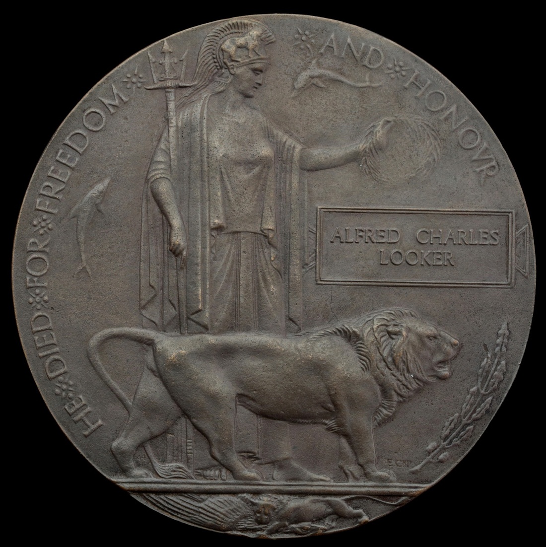 British War and Victory Medals (GS-68748 Pte. A. C. Looker. R. Fus.); Great War Bronze Memorial Plaque (Alfred Charles Looker), minor contact marks to second, overall good very fine (3)