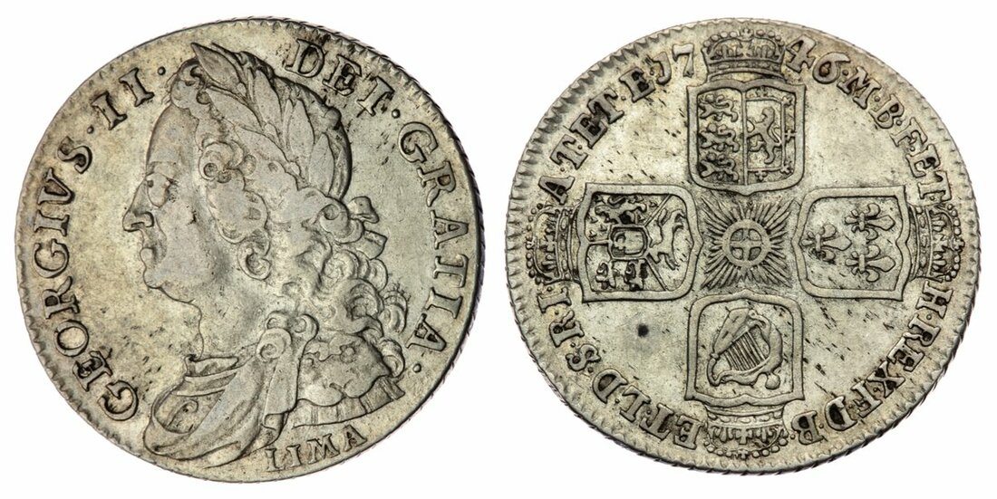George II (1727-1760), LIMA Shilling, 1746, old laureate, draped and cuirassed bust left, LIMA below, rev. four crowned shields cruciform, seven strings to harp, obliquely milled edge, 5.98g, 6h (Bull 1725 [R2]; ESC 1206; Spink 3703), cleaned, otherwise a bolder fine, scarce
