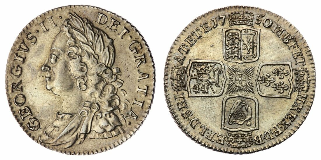 George II (1727-1760), 'Old Head' Shilling, 1750 over 46, ('5 over 4'), 'Wide 0', old laureate, draped and cuirassed bust left, rev. four crowned shields cruciform, seven strings to harp, obliquely milled edge, 6.01g, 6h (Bull 1732; ESC 1211; Spink 3704), bright and lightly wiped, otherwise lustrous, a really bold very fine, the overdate clear
