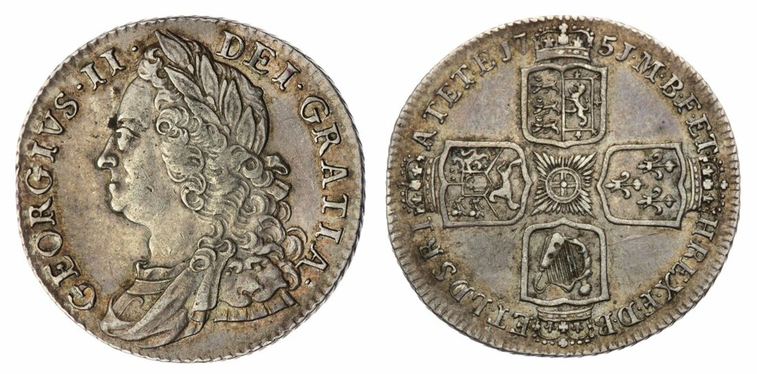 George II (1727-1760), 'Old Head' Shilling, 1751, old laureate, draped and cuirassed bust left, rev. four crowned shields cruciform, seven strings to harp, obliquely milled edge, 6.03g, 6h (Pywell-Phillips 348; Bull 1733 [R3]; ESC 1212; Spink 3704), lightly toned with hints of peripheral flare, a pleasing very fine, the key date