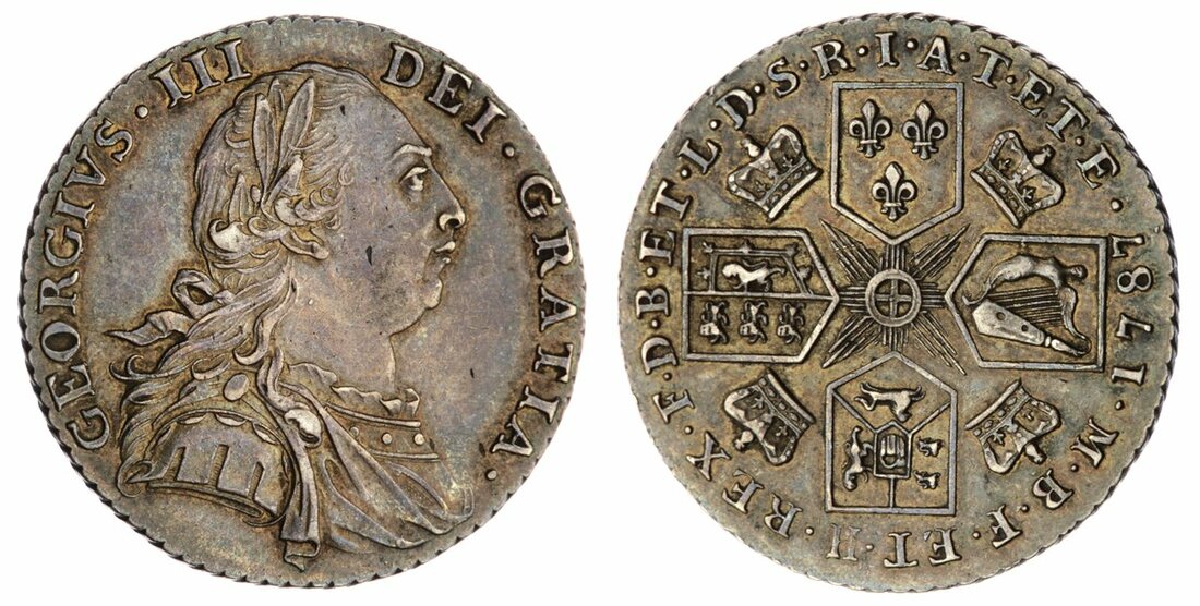 George III (1760-1820), Shilling, 1787, second laureate, draped and cuirassed bust right, no stop over head, rev. four crowned shields cruciform, no hearts in the Hanoverian shield, obliquely milled edge, 6.02g, 12h (Bull 2133; ESC 1218; Spink 3744), rub to highest points, otherwise neatly toned, almost extremely fine / good very fine