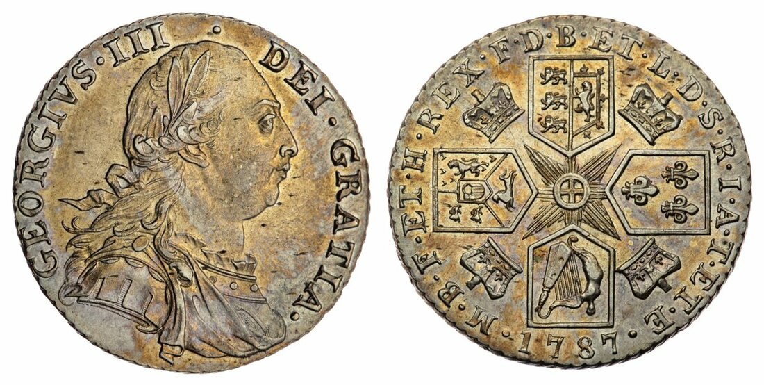 George III (1760-1820), Shilling, 1787, second laureate, draped and cuirassed bust right, rev. four crowned shields cruciform, with hearts in the Hanoverian shield, obliquely milled edge, 6.00g, 12h (Bull 2129; ESC 1225; Spink 3746), lightly wiped with patchy retoning, residually flashy fields, struck details almost extremely fine / a bold very fine