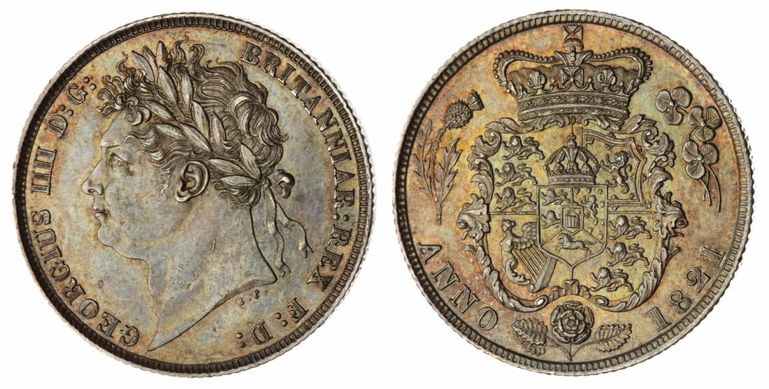 George IV (1820-1830), Shilling, 1821, laureate head left, rev. crowned garnished shield, edge milled, 5.63g, 6h (Bull 2396; ESC 1247; Spink 3810), colourful cabinet tone overlying lustrous fields, near extremely fine