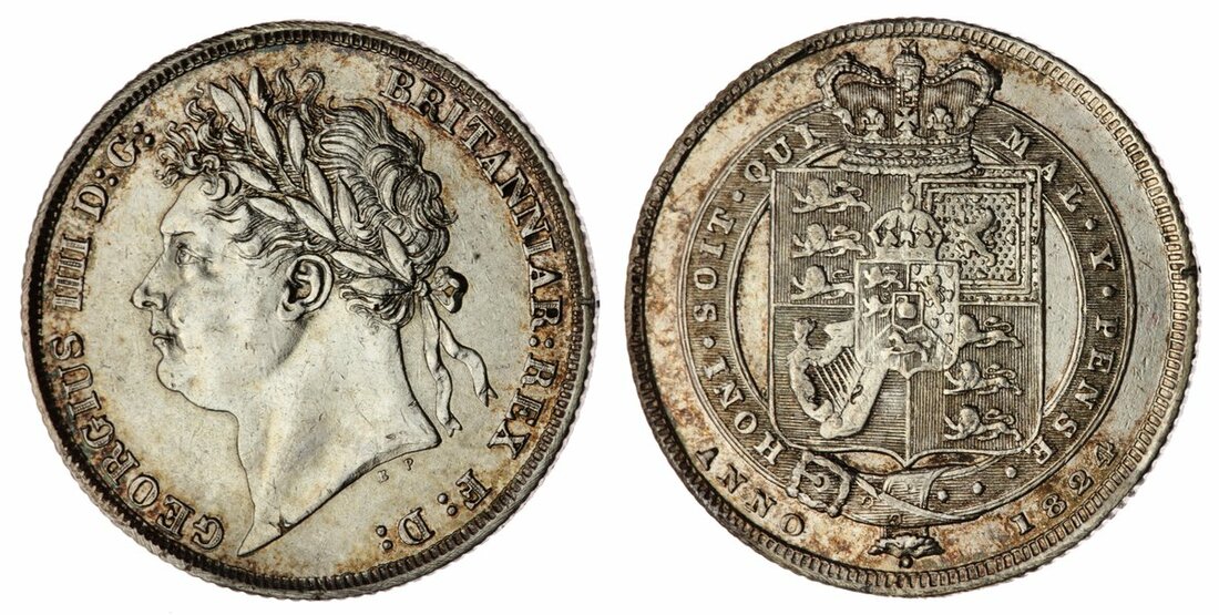 George IV (1820-1830), 'Garter' Shilling, 1824, laureate head left, rev. crowned shield in Garter, edge milled, 5.62g, 6h (Pywell-Phillips 505; Bull 2400; ESC 1251; Spink 3811), removed from a mount at 12 o'clock with polished surfaces, otherwise struck details a bolder very fine