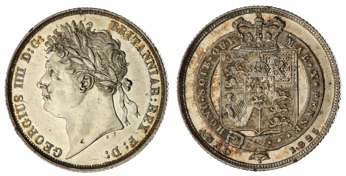 George IV (1820-1830), 'Garter' Shilling, 1825, Type 2, laureate head left, rev. crowned shield in Garter, edge milled, 5.66g, 7h (Pywell-Phillips 506; Bull 2402; ESC 1253; Spink 3811), lightly wiped with superficial marks, otherwise residually lustrous, especially to reverse with patchy toning, a really bold very fine, albeit softly struck on high points as usual for issue