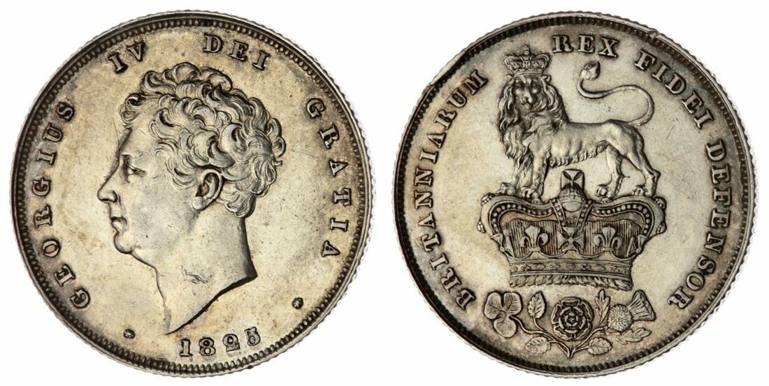 George IV (1820-1830), 'Lion' Shilling, 1825 '5 over 3', bare head left, rev. Lion atop crown, edge milled, 5.62g, 6h (Bull 2404; ESC -; Spink 3812), of subtly die-capped appeared with a broader rim, with heavier scuffs on neck, subsequently cleaned, nevertheless a clear example of the '5 over 3' variety which is evidently the result of die cudding, very fine, supposedly extremely rare'