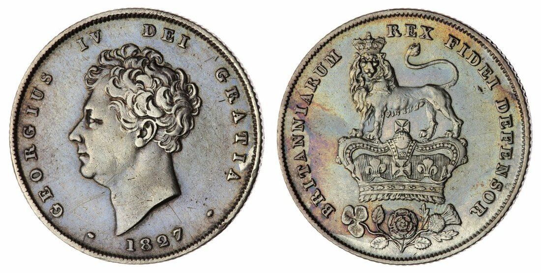 George IV (1820-1830), 'Lion' Shilling, 1827, bare head left, rev. Lion atop crown, edge milled, 5.63g, 6h (Bull 2412; ESC 1259; Pywell-Phillips 509; Spink 3812), polished and retoned, otherwise strictly very fine, the scarcest date of the Chantrey series