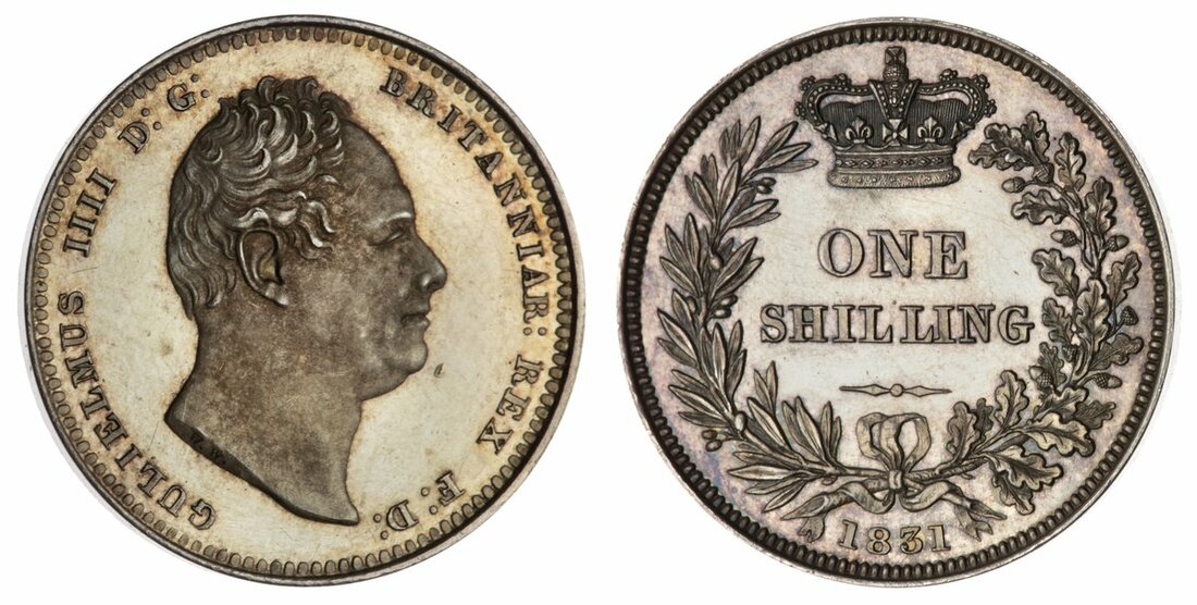 William IV (1830-1837), Proof Shilling, 1831, bare head right, block W. W. on truncation, rev. crowned value in wreath, edge plain, 5.70g, 7h (Bull 2488; ESC 1266; Spink 3835), bright and slightly hairlined, but otherwise brilliant fields with a small metal flaw before chin, evidence of stain removal from reverse field, nevertheless the portrait supremely cameo with appealing 'frost', extremely fine, rare and only issued with the Coronation Proof sets