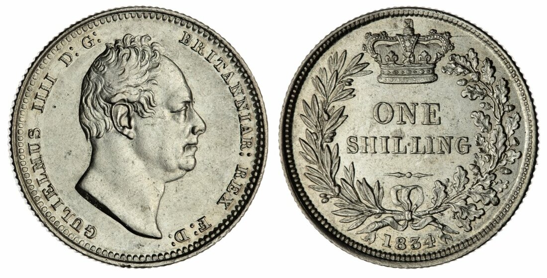 William IV (1830-1837), Shilling, 1834, bare head right, block W. W. on truncation, rev. crowned value in wreath, edge plain, 5.66g, 6h (Bull 2489; ESC 1268; Spink 3835), cleaned with resultant hairlines and surface brightness, otherwise residually lustrous, struck details almost extremely fine