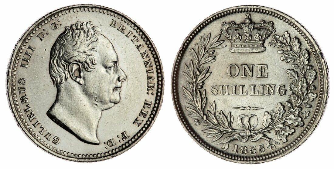 William IV (1830-1837), Shilling, 1835, bare head right, block W. W. on truncation, rev. crowned value in wreath, edge plain, 5.66g, 6h (Bull 2492; ESC 1271; Spink 3835), polished with a nasty dig below cheek and resultant hairlines in fields, the reverse residually lustrous and frosted, a slightly broad-striking with higher rims, struck details about extremely fine