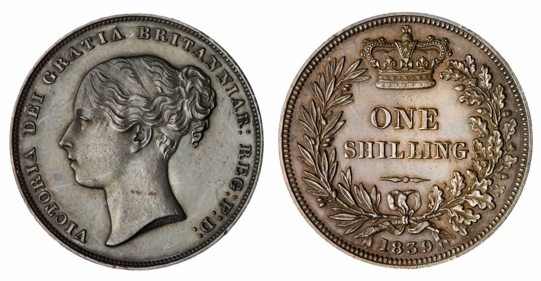 Victoria (1837-1901), Plain Edge Proof Shilling, 1839, Type A², second young head left, W.W. on truncation, rev. coin alignment, crowned value in wreath, edge plain, 5.69g, 6h (Bull 2977; ESC 1282; Spink 3903), once wiped and darkly retoned with coffee-grey surfaces and much residual brilliance, a pleasingly bold extremely fine, rare