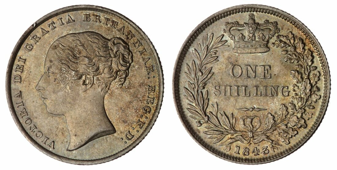 Victoria (1837-1901), Shilling, 1843, Type A³, second young head left, plain on truncation, rev. crowned value in wreath, edge milled, 5.66g, 7h (Bull 2989; ESC 1290; Spink 3904), an historic nick to rim at 11 o'clock, otherwise subdued cabinet toning over fresh mint fields, a small scuff on cheek, otherwise a handsomely bold extremely fine, the reverse much as issued