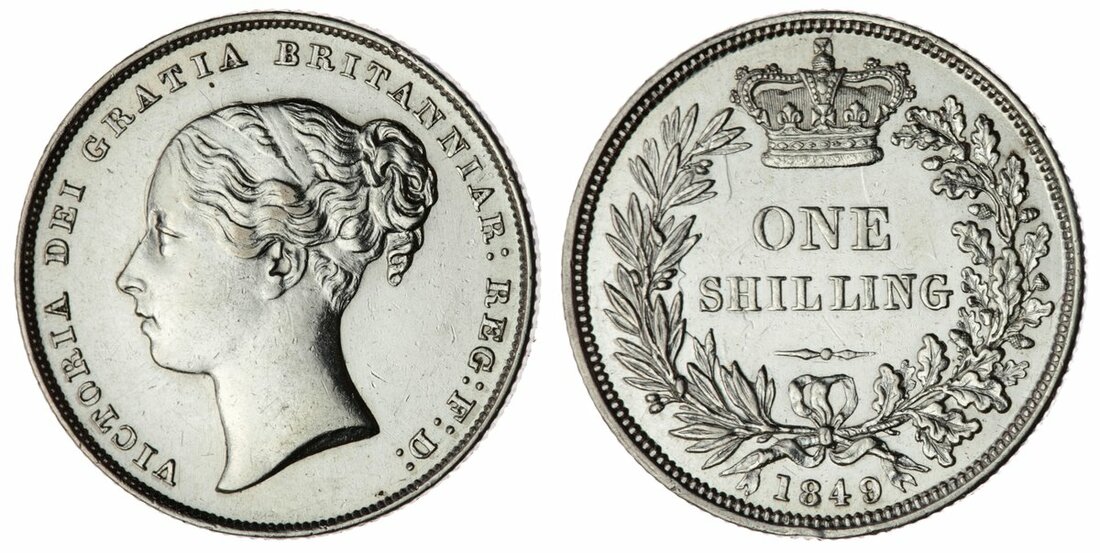 Victoria (1837-1901), Shilling, 1849, Type A³, second young head left, plain on truncation, rev. crowned value in wreath, edge milled, 5.64g, 7h (Bull 2995; ESC 1295; Spink 3904), some marks and polished but lustrous, a really bold very fine