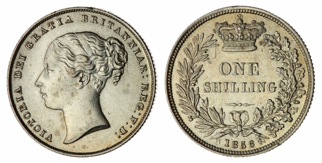 Victoria (1837-1901), Shilling, 1856, Type A³, second young head left, plain on truncation, rev. crowned value in wreath, edge milled, 5.65g, 6h (Bull 3007; ESC 1304; Spink 3904), cleaned but lustrous, a few rim nicks, otherwise about extremely fine