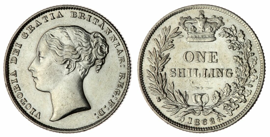 Victoria (1837-1901), Shilling, 1862, Type A³, second young head left, plain on truncation, rev. crowned value in wreath, edge milled, 5.65g, 6h (Bull 3021; ESC 1310; Spink 3904), lightly cleaned and bright hence, otherwise lustrous, a bolder very fine, a key date in series