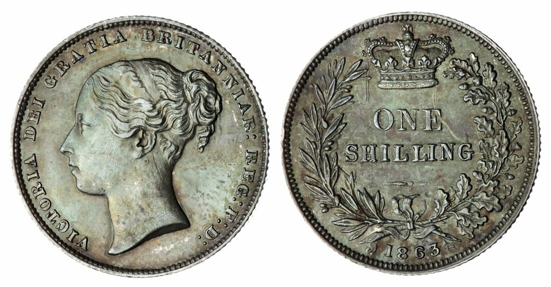 Victoria (1837-1901), Shilling, 1863 over 1, Type A³, second young head left, plain on truncation, rev. crowned value in wreath, edge milled, 5.63g, 6h (Bull 3023; ESC 1311A [R2]; Spink 3904), some historic scuffs on bust, otherwise darkly toned, probably artificially, nevertheless a bolder very fine, rare, a key date of series