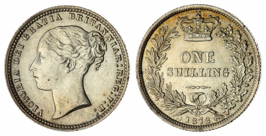 Victoria (1837-1901), Shilling, 1872 [Die 83], Type A6, third young head left, plain on truncation, rev. crowned value in wreath, die number below ties, edge milled, 5.69g, 7h (Bull 3042; ESC 1324; Spink 3906A), superficial marks on neck and a touch bright, otherwise lustrous, a really bold very fine