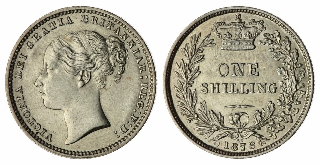 The third and fourth heads of Victoria's pre-Jubilee specie are notoriously difficult to demarcate in the Shilling series. Traditionally the distinction has been made between the 'loose ribbon' (Type A6) and the 'tight ribbon' (Type A7) seen before the trailing hair at the back of Queen Victoria's head. More properly this should be seen as the transition from 'the Shilling head' (third bust used to 1879) to the 'Sovereign head' (fourth bust used thereafter). However, this coin bears hallmarks of a transition, having the distinctive tighter ribbon profile of the fourth bust with the nigh on perpendicular clump of hair resulting above the ribbon, but also an additional tuft of hair below that does not subsequently feature on later issues. Given the vagaries of numismatic understanding of the portraiture during this period, it will be interesting to see if this inspires further research.