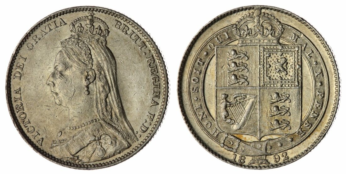 Victoria (1837-1901), 'Golden Jubilee' Shilling, 1892 'Narrow Date', larger 'Jubilee' bust left, thirteen pearls on necklace, J.E.B. on truncation, rev. crowned shield in Garter, edge milled, 5.62g, 12h (Bull 3147; ESC 1360; Spink 3927), lightly cleaned and bagmarked, otherwise a bolder very fine, the last year of issue