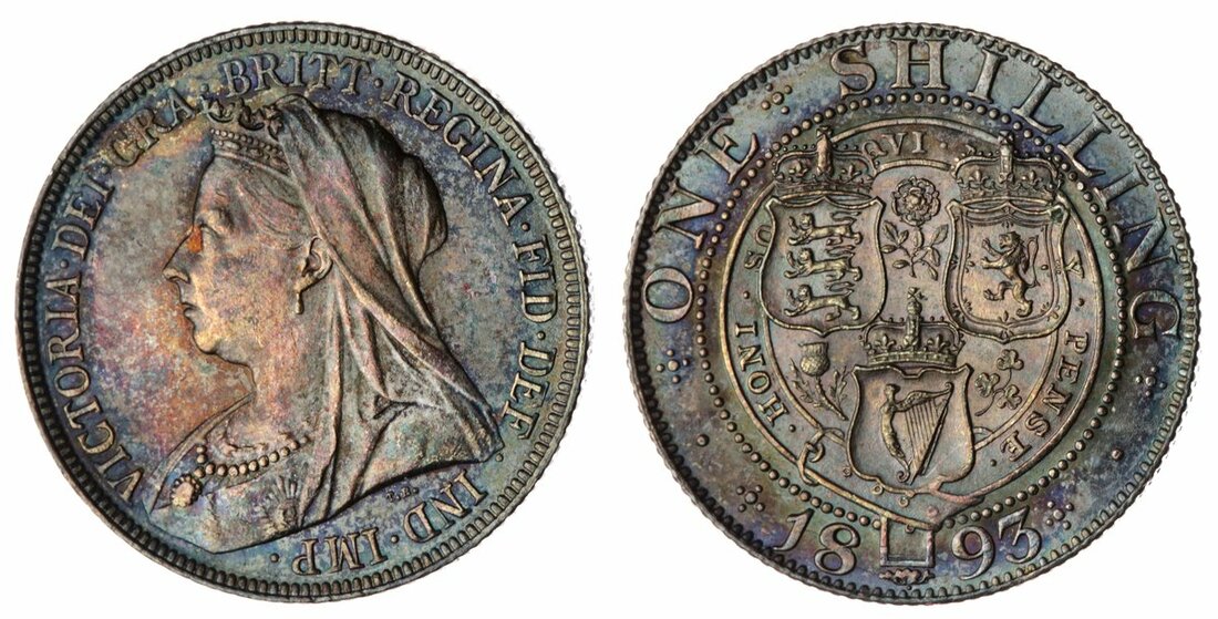Victoria (1837-1901), 'Old Head' Shilling, 1893, veiled head left, large lettering, rev. small rose, crowned shields in Garter, edge milled, 5.65g, 12h (Bull 3153; ESC 1361; Spink 3940), some faint bagmarks otherwise bullseye toned with underlying lustre, a bold extremely fine, the reverse much as struck