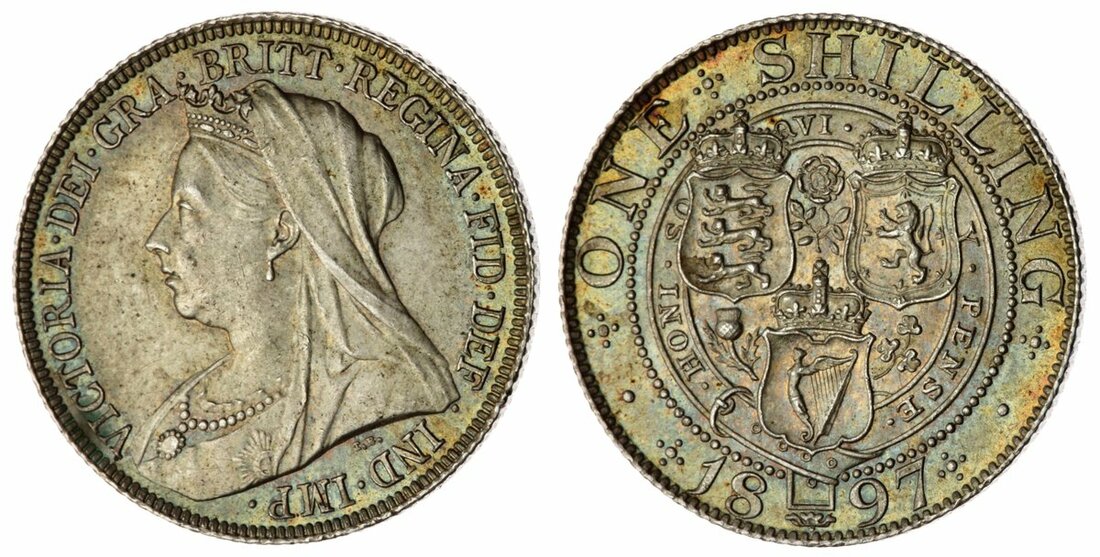 Victoria (1837-1901), 'Old Head' Shilling, 1897, veiled head left, large lettering, rev. large rose, crowned shields in Garter, edge milled, 5.69g, 11h (Bull 3162; ESC 1366; Spink 3940A), faint bagmarks, otherwise light gray-green toning, much as struck