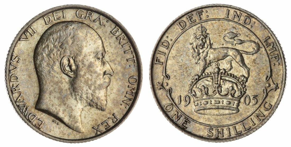 Edward VII (1901-1910), Shilling, 1905, bare head right, rev. Lion atop crown, edge milled, 5.67g, 11h (Bull 3591 [R2]; ESC 1414; Spink 3982), lightly wiped with speckled purplish-orange retoning, otherwise residually lustrous, an unusually strong strike for issue, a pleasing very fine, the reverse better, the fabled key date of series, rare thus