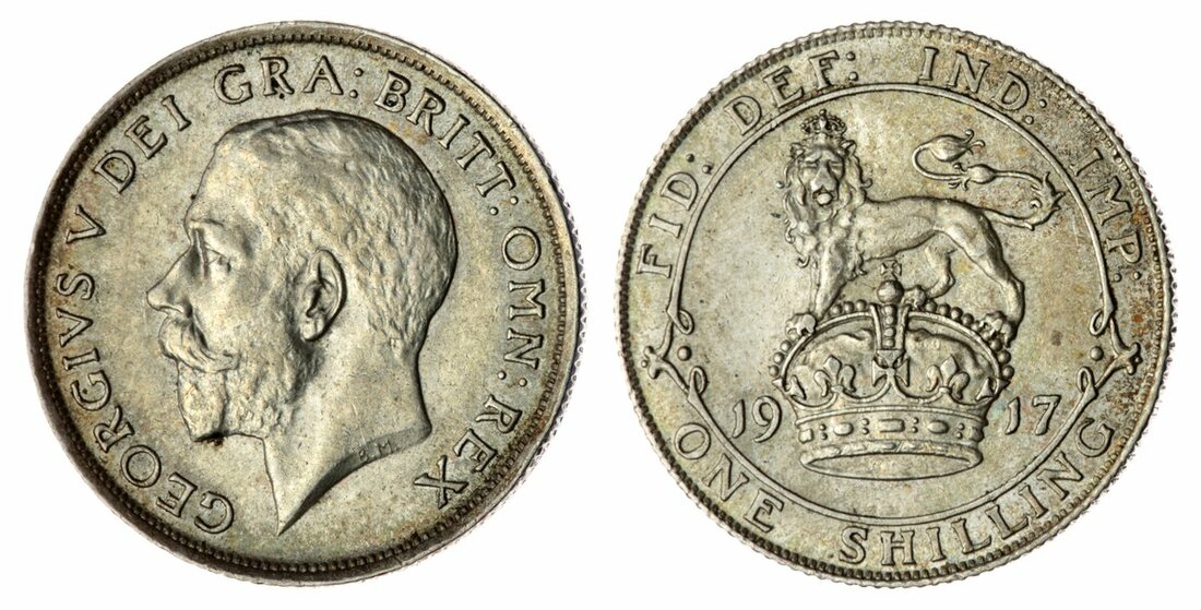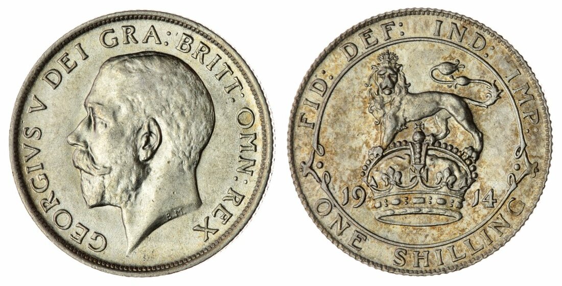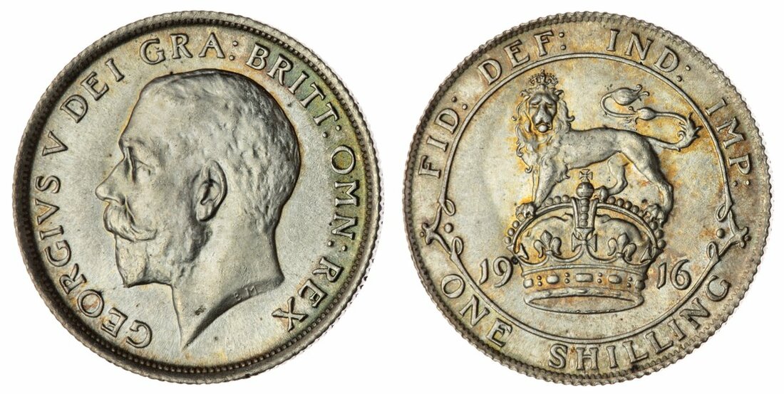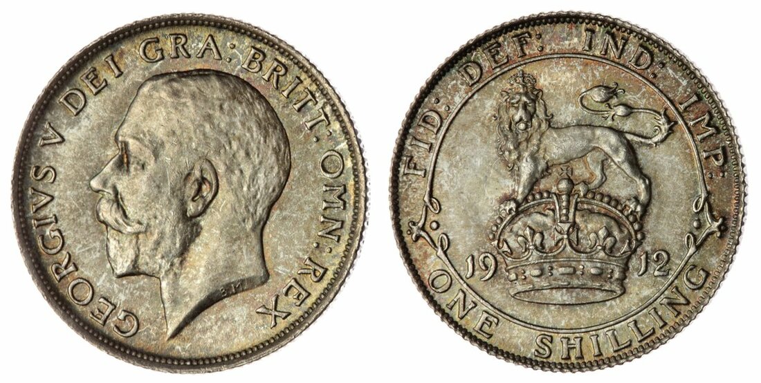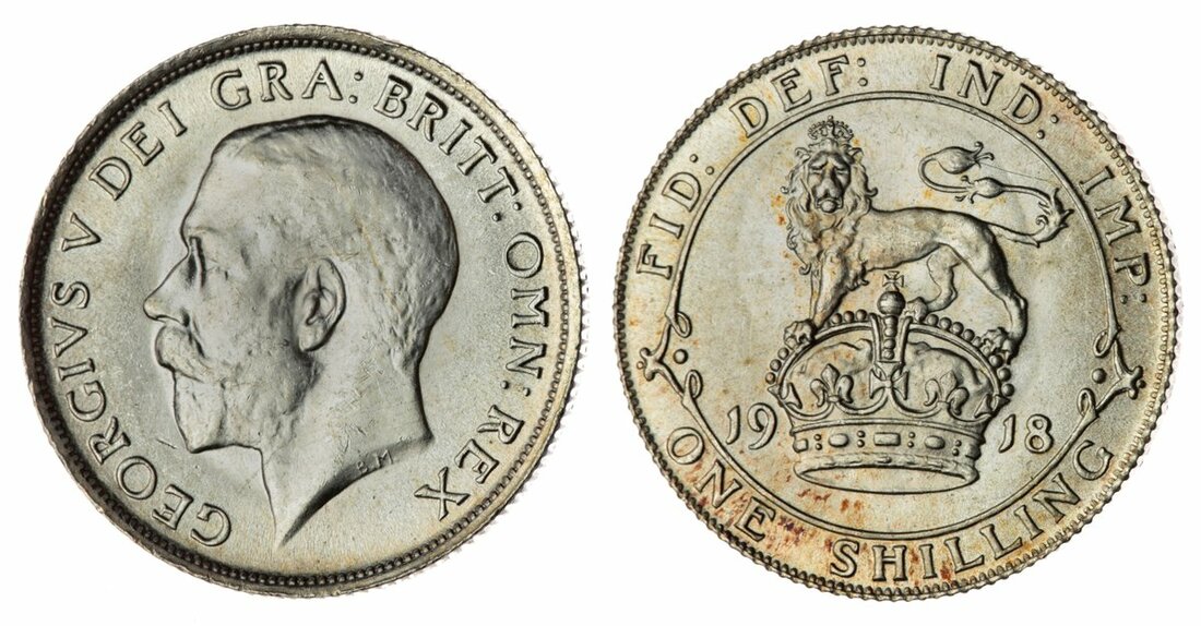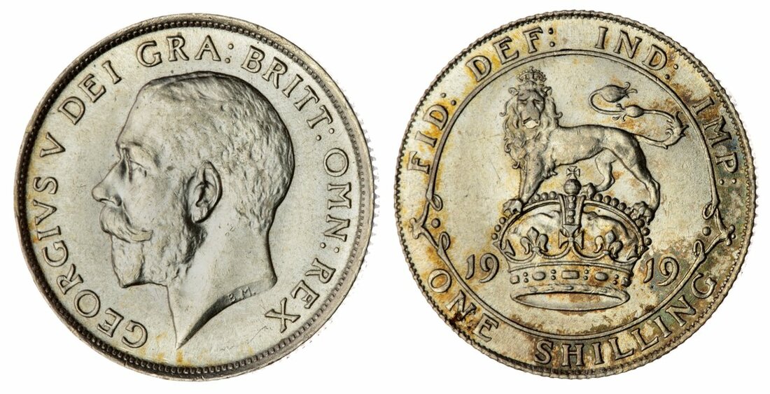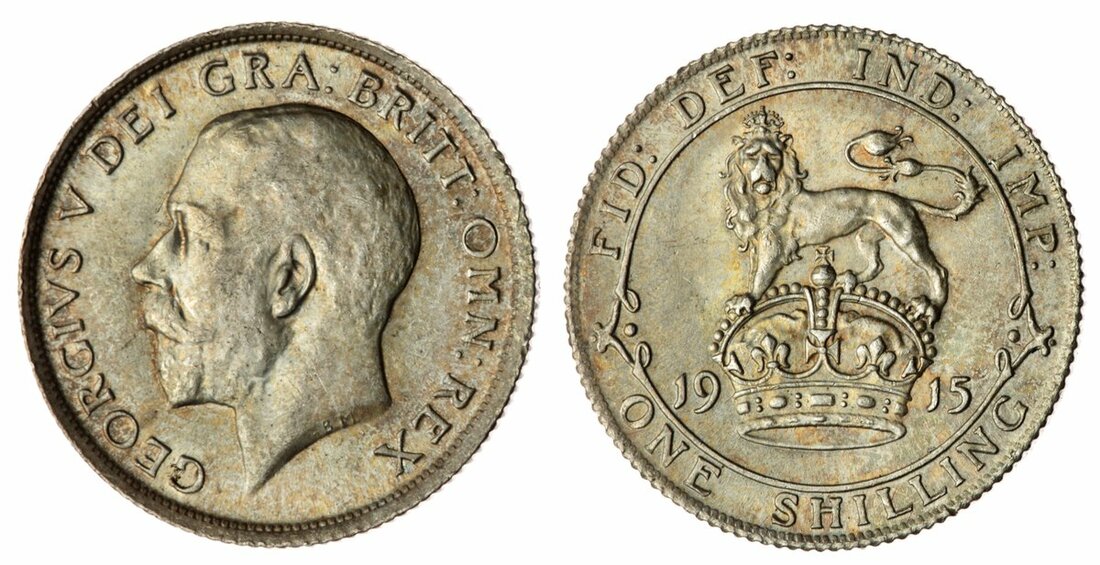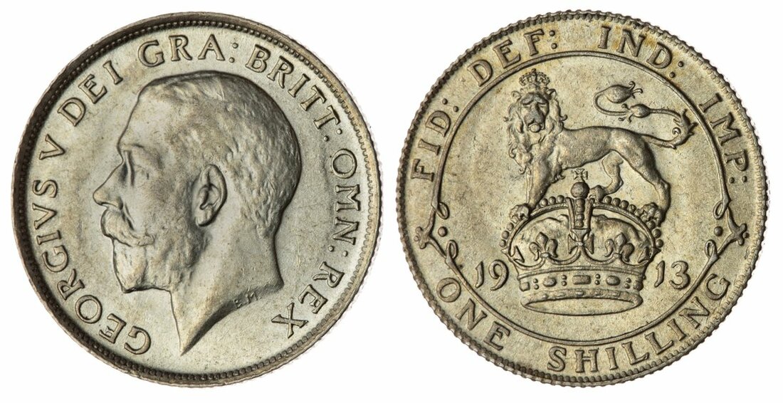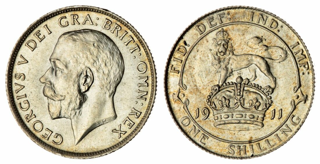 George V (1910-1936), First Issue, Shillings, 1911-1919, in .925 Silver (9), bare head left, rev. Lion atop crown, edge milled (Bull 3799, 3801-3808; ESC 1420, 1422-1429; Spink 4013), generally choice, extremely fine to much as struck, some lightly toned (9)