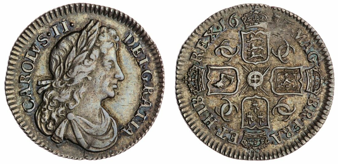 Charles II (1660-1685), Sixpence, 1675 over 4, laureate and draped bust right, rev. interlinked C's in angles, three strings to harp, obliquely milled edge, 2.87g, 6h (Pywell-Phillips 75-76; Viles 3781; Bull 568; ESC 1514; Spink 3382), some striking weakness to date, the overdate nevertheless clear, otherwise lustrous and attractively toned, iridescent in legends, a most pleasingly bold very fine, scarce in this state