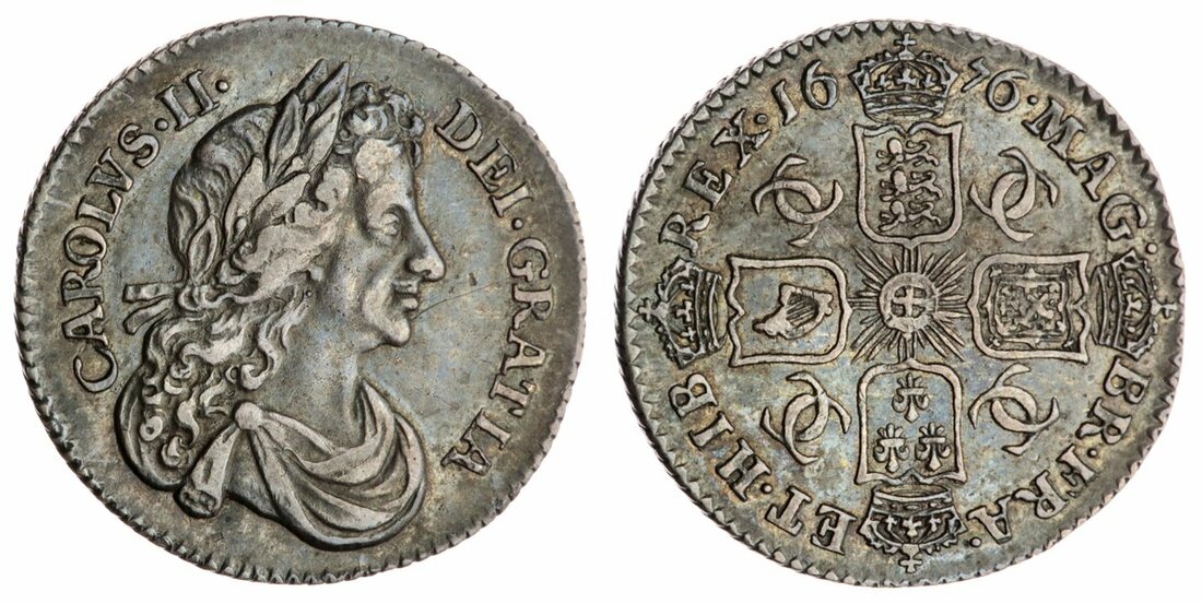 Charles II (1660-1685), Sixpence, 1676, laureate and draped bust right, rev. interlinked C's in angles, three strings to harp, obliquely milled edge, 3.02g, 6h (Bull 569; ESC 1515 [R5]; Spink 3382), a handsome example, richly cabinet toned and residually lustrous, a wholesome and pleasing very fine, extremely rare with the unaltered date and classified by Bull as R5