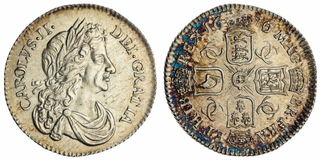 Charles II (1660-1685), Sixpence, 1676 over 5, laureate and draped bust right, rev. interlinked C's in angles, three strings to harp, obliquely milled edge, 2.98g, 6h (Bull 570; ESC 1515A; Spink 3382), lightly wiped, hence the obverse bright, otherwise lustrous, the portrait pleasingly bold, almost extremely fine, rare