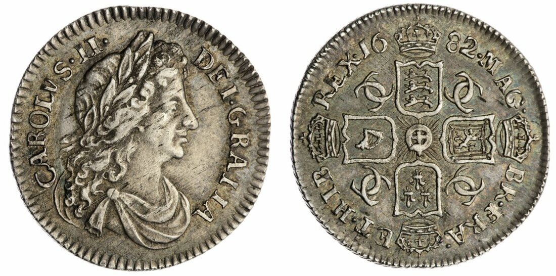 Charles II (1660-1685), Sixpence, 1682 over 1, laureate and draped bust right, rev. interlinked C's in angles, three strings to harp, obliquely milled edge, 2.92g, 6h (Pywell-Phillips 83; Bull 579; ESC 1522 [R2]; Spink 3382), the obverse very lightly flecked, nevertheless with a pleasing tone and underlying lustre, good very fine, a scarce date