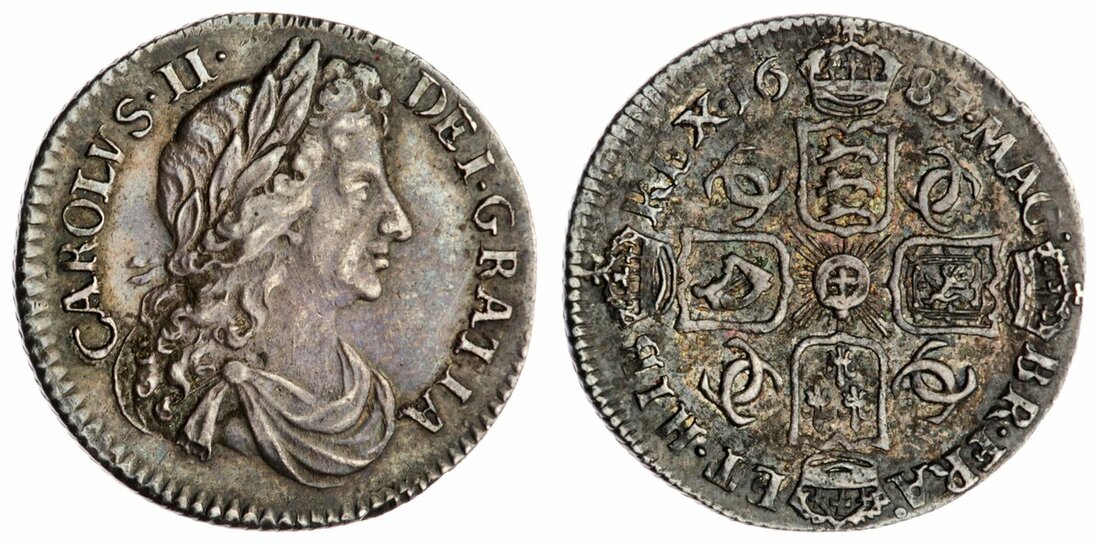Charles II (1660-1685), Sixpence, 1683, laureate and draped bust right, rev. interlinked C's in angles, four strings to harp, obliquely milled edge, 3.01g, 6h (Pywell-Phillips 84; Viles 3786; Bull 580; ESC 1523; Spink 3382), some flecking on hair, otherwise lustrous and richly cabinet toned, good very fine / very fine