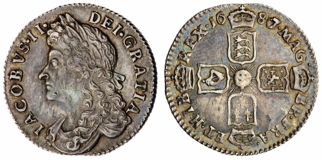 James II (1685-1688), Sixpence, 1687 over 6, laureate and draped bust left, rev. early shields, five strings to harp, obliquely milled edge, 2.99g, 5h (Bull 776; ESC 1526A; Spink 3412), nailmark to chin and dark patch of retoning on throat, the usual adjustment to French shield, otherwise a pleasingly toned and lustrous coin, the overdate exceedingly clear, a bolder very fine / very fine