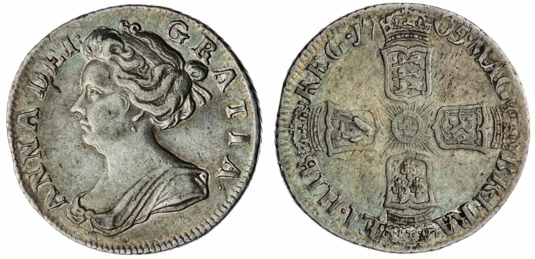 Anne (1702-1714), Pre-Union, Sixpence, 1705, draped bust left, rev. crowned cruciform shields, five strings to harp, plain in angles, obliquely milled edge, 2.94g, 6h (Bull 1447; ESC 1583 [R2]; Spink 3591), gunmetal tone overlying lustrous surfaces, a trace of flecking, otherwise a pleasingly bold very fine, a scarce date