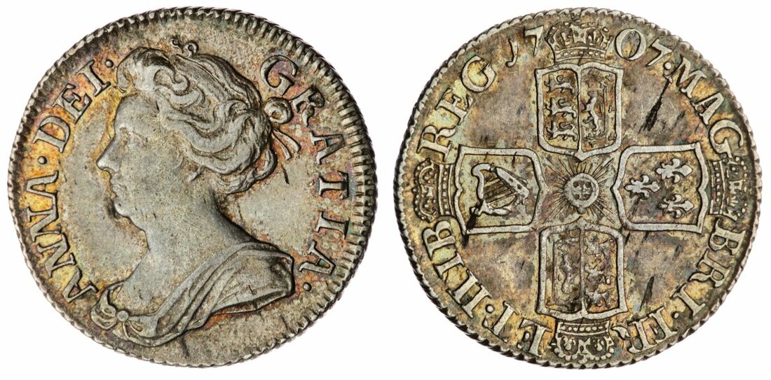 Anne (1702-1714), Post-Union, Sixpence, 1707, draped bust left, rev. crowned cruciform shields, five strings to harp, plain in angles, obliquely milled edge, 3.02g, 6h (Bull 1453; ESC 1587; Spink 3619), linear haymarking to reverse, otherwise lightly toned and lustrous, strictly very fine but presents betteR