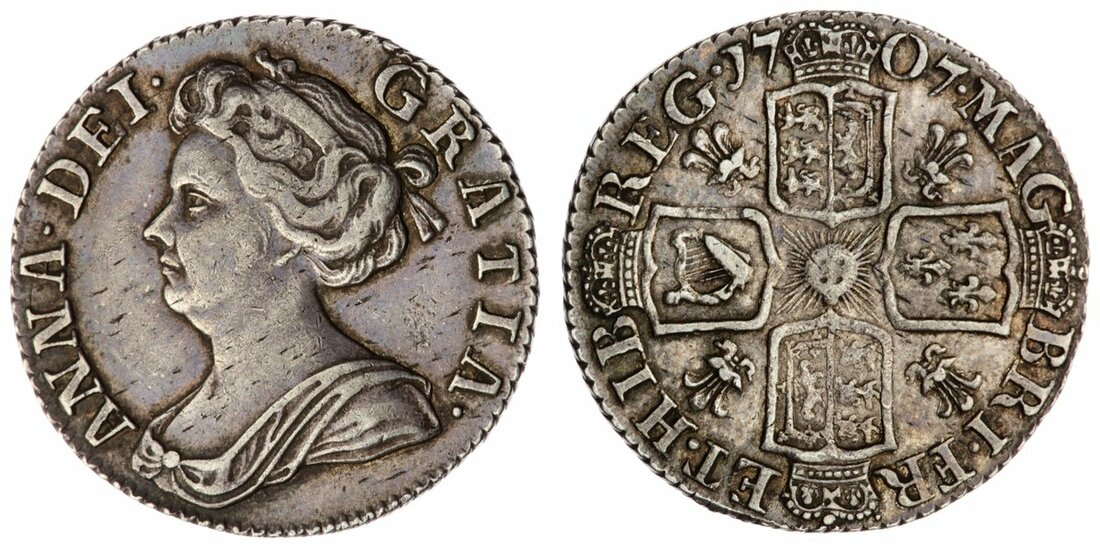 Anne (1702-1714), Post-Union, 'Plumes' Sixpence, 1707, draped bust left, rev. crowned cruciform shields, six strings to harp, plumes in angles, obliquely milled edge, 3.00g, 6h (Bull 1455; ESC 1590; Spink 3623), lightly toned with softness to hair, a pleasing very fine / good very fine