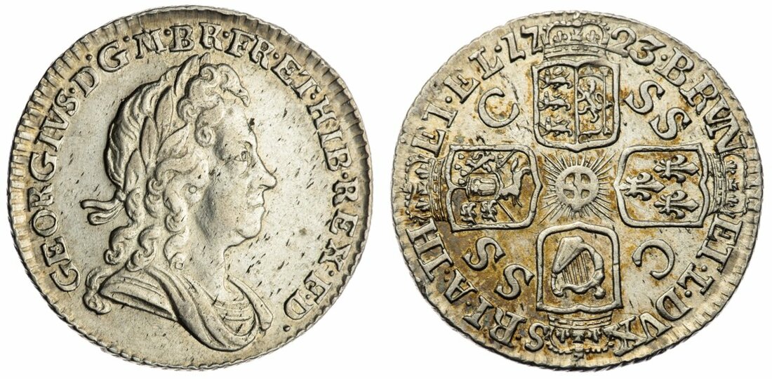 George I (1714-1727), 'South Sea Company' Sixpence, 1723, small lettering, laureate and draped bust, rev. large lettering, crowned cruciform shields, five strings to harp, SS and C alternating in angles, obliquely milled edge, 3.01g, 6h (Bull 1612; ESC 1600; Spink 3652), lightly wiped and bright, otherwise lustrous with hints of toning, a bolder very fine, a good opportunity on the eve of the Tercentenary of issue