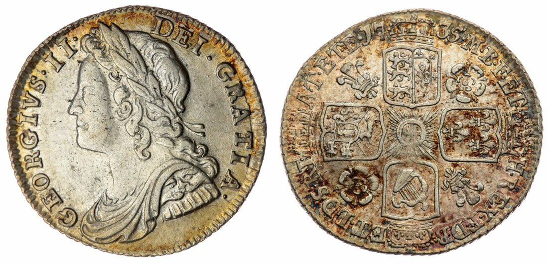 George II (1727-1760), 'Roses and Plumes' Sixpence, 1735, the 5 re-entered, young laureate, draped and cuirassed bust left, rev. crowned cruciform shields, roses and plumes in angles, obliquely milled edge, 3.00g, 6h (Pywell-Phillips 355; Bull 1745; ESC 1610 [R2]; Spink 3707), lightly cleaned in obverse field and residually lustrous, traces of orangey-purple tone to reverse surfaces, a bolder very fine, a scarce date in series