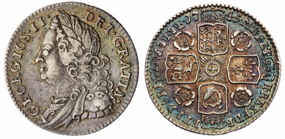 George II (1727-1760), 'Roses' Sixpence, 1745, old laureate, draped and cuirassed bust left, rev. crowned cruciform shields, roses in angles, obliquely milled edge, 2.97g, 6h (Bull 1753; ESC 1615; Spink 3709), rub to high points, otherwise toned, very fine, the reverse better
