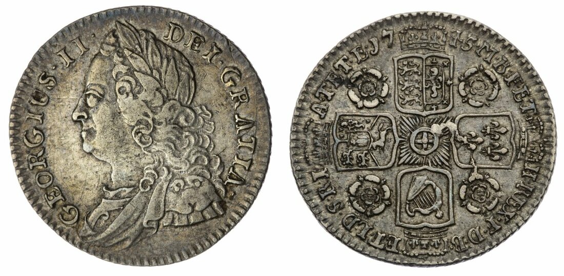 George II (1727-1760), 'Roses' Sixpence, 1745 "over 3", old laureate, draped and cuirassed bust left, rev. crowned cruciform shields, roses in angles, obliquely milled edge, 3.06g, 6h (Viles 3824; Bull 1754; ESC 1616 [R2]; Spink 3709), metal flaw to Garter and fourth rose, lightly toned, almost very fine, scarce with the overdate