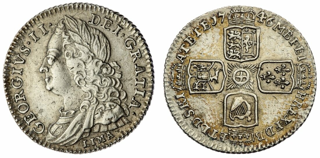 George II (1727-1760), LIMA Sixpence, 1746 over 5, old laureate, draped and cuirassed bust left, LIMA below, rev. crowned cruciform shields, seven strings to harp, obliquely milled edge, 2.94g, 6h (Bull 1758; ESC 1618A; Spink 3710A), lightly cleaned but residually lustrous, a bold very fine, the overdate clear and rare
