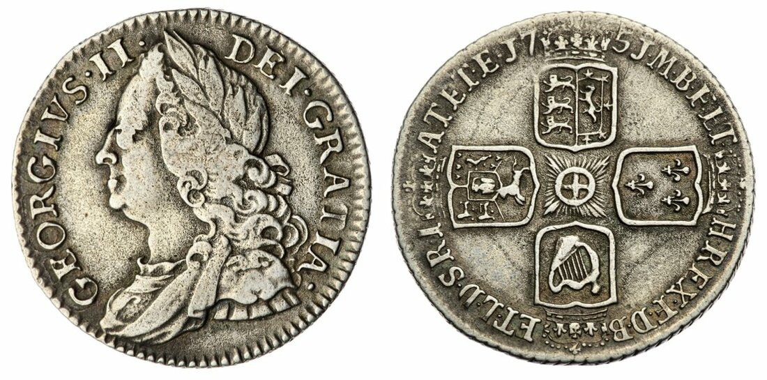 George II (1727-1760), Sixpence, 1751, old laureate, draped and cuirassed bust left, rev. crowned cruciform shields, six strings to harp, angles plain, obliquely milled edge, 2.88g, 6h (Bull 1761; ESC 1621 [R2]; Spink 3711), lightly cleaned with faintly pitted surfaces, fine, the reverse better, the key date of series