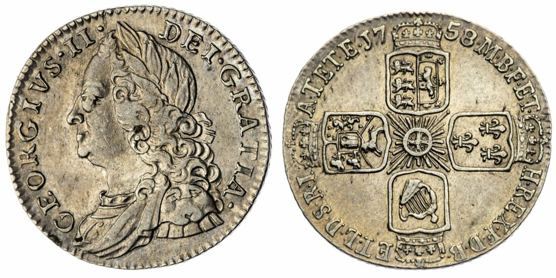 George II (1727-1760), Sixpence, 1758, old laureate, draped and cuirassed bust left, rev. crowned cruciform shields, six strings to harp, obliquely milled edge, 3.02g, 6h (Bull 1763; ESC 1623; Spink 3711), lightly cleaned but residually toned and lustrous, superficial hairlines across fields, a bolder very fine