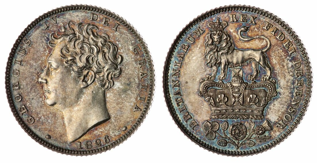 George IV (1820-1830), Proof Sixpence, 1826, bare head left, rev. lion on crown, milled edge, 2.88g, 7h (Bull 2435; ESC 1663; Spink 3815), small nailmark to neck, and lightly hairlined, otherwise brilliant with partial toning, a pleasingly bold extremely fine, as issued in the first 'Proof set'