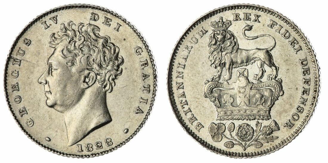 George IV (1820-1830), Sixpence, 1828, bare head left, rev. lion on crown, milled edge, 2.82g, 6h (Bull 2438; ESC 1665; Spink 3815; ), die flaw through I in GEORGIUS, lightly cleaned and with surface friction, otherwise residually lustrous, a bolder very fine, the forgotten Key date of series with only 15,840 pieces reportedly struck
